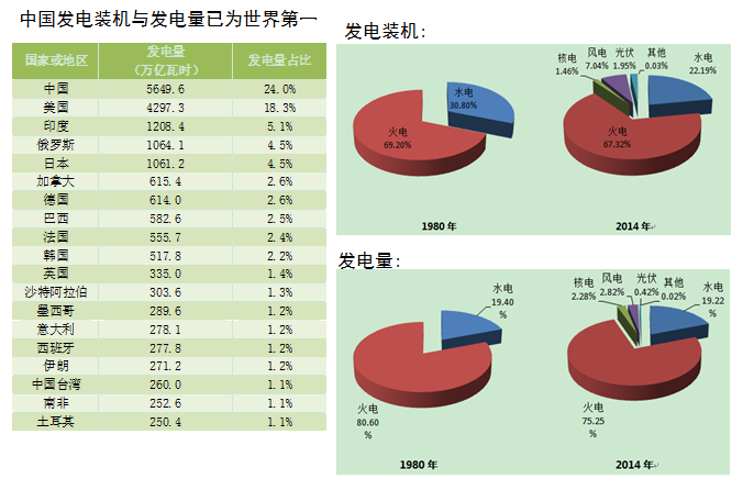 據(jù)冉澤介紹,我國電力行業(yè)經(jīng)歷了數(shù)十年的發(fā)展,我國的發(fā)電裝機容量和發(fā)電量都取得了巨大的發(fā)展,中國發(fā)電裝機容量在2013年實現(xiàn)了對美國的超越,目前總裝機容量位居世界第一。截至2014年底,我國發(fā)電裝機容量已經(jīng)達到13.6億千瓦。我國2010年發(fā)電量已位居世界第一,截至2014年中國發(fā)電量達到5649.6太瓦時(萬億瓦時)。發(fā)電結(jié)構(gòu)也已實現(xiàn)了多元化,但煤電亦然占比亦然巨大。