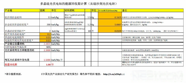 目前很多版本的光伏能量回收期和碳排放的計(jì)算數(shù)據(jù)中,均沒有包括從硅砂(SiO2)到冶金硅一段的能耗,而是從冶金硅料開始計(jì)算到光伏系統(tǒng),包括李俊峰編寫的研究報(bào)告。我估計(jì)是因?yàn)楣枭呈菑V普工業(yè)原料,比如:半導(dǎo)體、化工、建筑等,光伏的產(chǎn)業(yè)鏈從硅料才開始計(jì)算。有一小搓人一直以此攻擊光伏隱瞞能耗。本人重新計(jì)算,從硅沙直到光伏系統(tǒng)的全產(chǎn)業(yè)鏈能耗和碳排放,一網(wǎng)打盡所有涉及的輔料、封裝材料(鋼化玻璃,EVA,TPT等)、光伏電站系統(tǒng)配套設(shè)備(并網(wǎng)控制逆變器、電纜、開關(guān)、支架、儀表)等的生產(chǎn)能耗,以正視聽。
