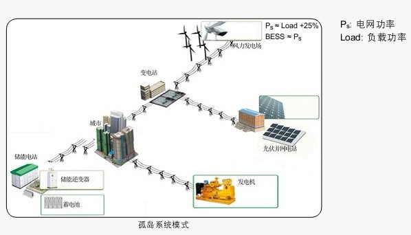 孤島系統(tǒng)模式是BESS與一個(gè)或多個(gè)發(fā)電系統(tǒng)并聯(lián)形成一個(gè)局部的“微網(wǎng)”。孤島系統(tǒng)的主要特征是局部電網(wǎng)與大電網(wǎng)脫離,BESS的額定功率與局部電網(wǎng)產(chǎn)生的總功率大致相等。在這個(gè)系統(tǒng)中,BESS必須可以充當(dāng)網(wǎng)路電源,給“微網(wǎng)”提供電壓和頻率控制。