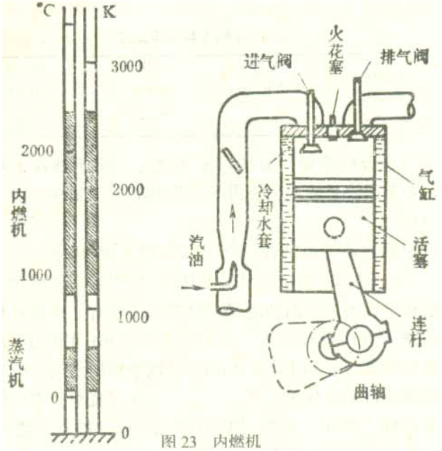 運輸用的動力應具有機動性。為了去掉龐大的鍋爐系統和換熱器金屬耐受高溫的限制,19世紀下半葉出現了將燃料在發動機內部燃燒的內燃機(圖23),內燃機的大多數是四沖程,即活塞上下移動四次,經過吸氣、壓縮、燃燒膨脹、排氣等過程完成一個“循環”。也有上下移動兩次完成一個循環的,叫作二沖程。因為這種熱機間歇地短時間接觸燃燒氣體,并且采取冷卻措施,所以可以采用較高的(瞬時)燃燒溫度如表5所示。