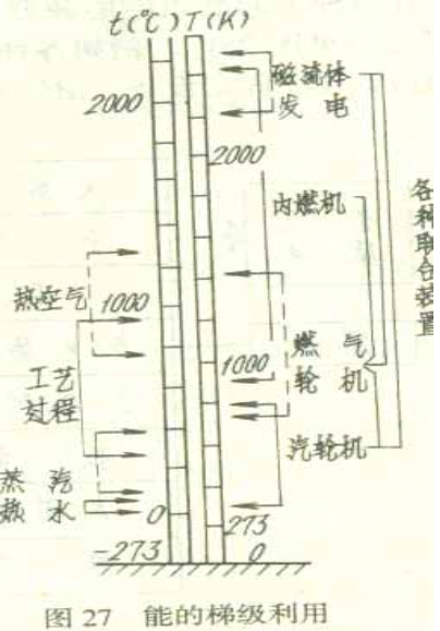 8、在能源利用方面,應該按照基本科學原理,按照能的不同品位,按照各盡其用的原則來進行,例如根據熱源溫度的高低選擇適當的熱機和熱裝置,大力發展各種聯合循環與熱電并供,余能利用等(見圖27)。