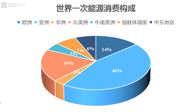 在世界能源發展中,由于中國、印度兩大發展中國家的經濟快速增長,亞洲成為全球能源消費的中心,據BP世界能源統計年鑒顯示,一次能源消費方面,亞洲能源消費在世界一次能源消費總量中占比達到46%,北美洲占全球一次能源消費的19.4%,歐洲的能源消費占比為13.9%。