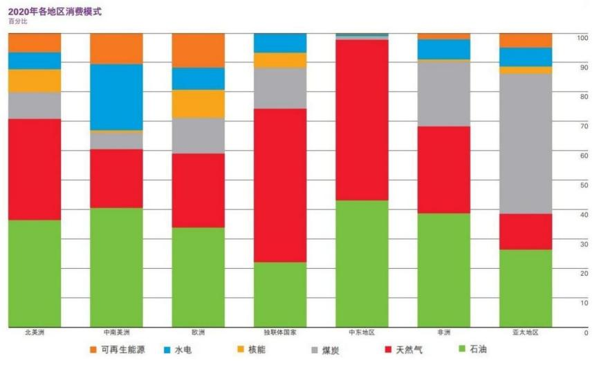 1)北美洲:從上圖可以看出,北美洲北美洲的能源消費格局以油氣為主,多種能源作為補充。數據方面,截至2020年底,北美洲的石油消費占一次能源比例約為36%,天然氣占比為34%,煤炭占比為9.2%,核能占比為7.7%,水電占比為5.8%,可再生能源占比為6.5%。