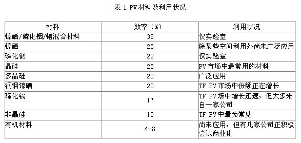TF PV技術所涉及的材料主要包括非晶硅(α-Si)、碲化鎘(CdTe)、銅銦鎵硒(CIGS)、銅銦硒(CIS)以及有機和有機-無機混合材料,每種材料都各有利弊。下表列出了主要TF PV材料及其利用狀況。