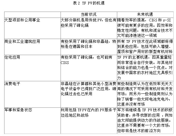 根據對2007-2015年的預測,TF PV涵蓋的所有應用都將取得強勁增長。在成本和重量成為關鍵因素而轉換效率并不占優先地位的市場,TF PV具有最大的競爭優勢。增長最快的領域很可能是在受TF PV價格優勢驅動的消費電子和住宅市場。表2列舉了TF PV可獲得突破的機遇所在。