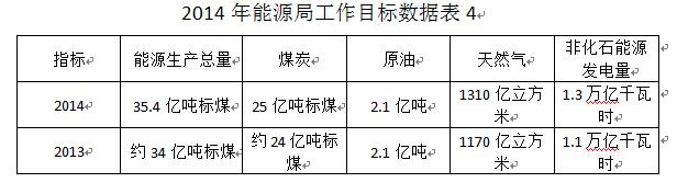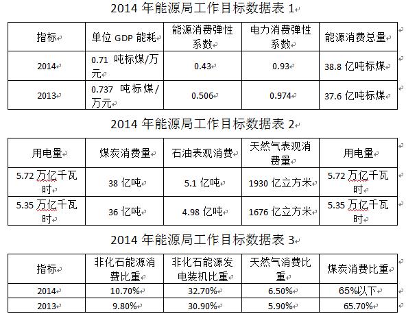 2014年能源工作目標(biāo)中擬定,能源消費(fèi)總量38.8億噸標(biāo)準(zhǔn)煤左右,增長(zhǎng)3.2%;單位GDP能耗0.71噸標(biāo)準(zhǔn)煤/萬(wàn)元,比2010年下降12%;能源消費(fèi)彈性系數(shù)達(dá)到0.43左右;非化石能源消費(fèi)比重提至10.7%,天然氣占一次能源比重達(dá)到6.1%,煤炭降至65%以下。