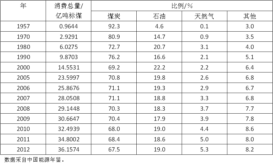 表3形象地顯示直到上世紀末煤炭在中國能源構成中仍居絕對優勢,大于70%。其所對應的1970至2000年的30年中經濟發不夠快且起伏較大,能源消費總量平均年增率為5.49%。2000至2009年的9年期間GDP快速增長且能源消費彈性系數較高,能源消費總量平均年增為率8.11%[10]。能源的緊缺使2005至2009年間煤炭比例重回到大于70%,甚至石油比例也呈略降之勢。顯然,這種經濟的快速增長在能源上是以煤炭使用量大增為支撐的。此后到2012年的3年間經濟發展速度稍降、能源消費量年均增長率也降到5.65%,相應地煤炭占能源比例也略低于70%,2012年仍為67.5%(表3)。還可以參考BP世界能源年鑒的資料,在其能源總量中包括了新能源的條件下,筆者計算2012年中國煤炭、石油、天然氣占能源的比例依次為68.5%、17.7%、4.7%,其余9.1%中核電、水電、新能源分別占0.8%、7.1%、1.2%;作為對比在全球總計中煤炭、石油、天然氣占能源的比例依次為29.9%、33.1%、23.9%,其余13.1%中核電、水電、新能源分別占4.5%、6.7%、1.9%。無論從油氣、還是僅從天然氣所占比例上看,目前中國的能源構成僅只能與上世紀40年代后期的全球的平均數字(表1)相比。從這點上看,中國仍處在能源的煤炭時代。