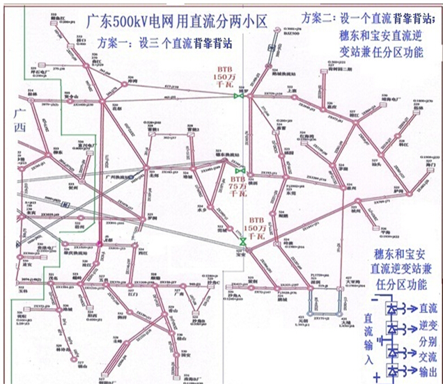 廣東應(yīng)用直流再分兩個小區(qū),其中方案一設(shè)三個直流背靠背站,投資約30億元;方案二因運用直流逆變站兼任分區(qū)功能,祗增裝一個直流背靠背站,投資祗約10億元,都可徹底解決短路電流超標(biāo)問題。