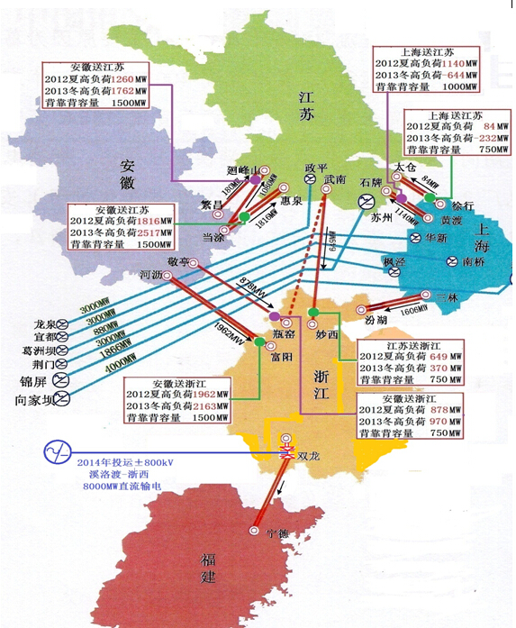 我國早已應(yīng)用的[西北-華中][東北-華北]和[中-俄]黑河背靠背運行可靠,具備良好分區(qū)功能。圖2按華東省市間2012年夏季高峰/2013年冬季高峰調(diào)潮流(來自國網(wǎng)報告)研究直流背靠背的位置和容量,隨著電源/負(fù)荷的發(fā)展,所有省市間潮流應(yīng)有減無增,以選擇其容量。