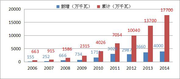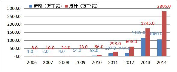 我國(guó)的光伏發(fā)電裝機(jī)容量2005年僅為7萬(wàn)KW左右,相比歐美等西方發(fā)達(dá)國(guó)家,我國(guó)的光伏發(fā)電產(chǎn)業(yè)起步較晚,但發(fā)展很快,到2014年發(fā)電裝機(jī)已達(dá)到2805萬(wàn)千瓦,與“十一五”末的2005年相比增長(zhǎng)了400倍。