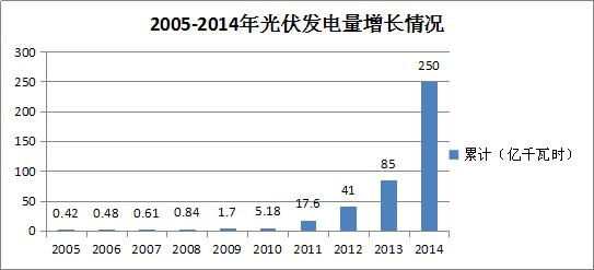 我國(guó)的光伏發(fā)電量2005年僅為0.42億KWH,到2014年已達(dá)到250億KWH,比2005年增長(zhǎng)了近595倍,雖然基數(shù)非常小,但是增長(zhǎng)速度非常快。