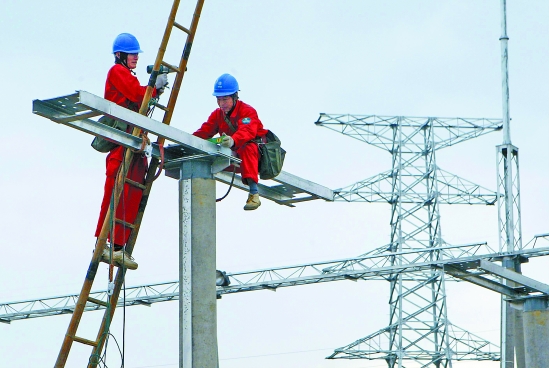 電力施工人員在湖州市220千伏梅溪變電站焊接母線支架,以提高主要電網受電和供電能力。