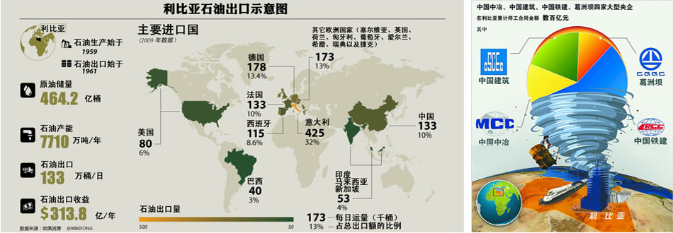 石油合作:目前,中石油集團下屬的7家石油企業和中海油集團下的1家企業先后到利比亞開拓業務,其中,中石油國際工程公司于2005年中標一石油區塊,BGP石油物探行業在利比亞市場份額約達60%,中石油管道局2002年以來,一直承擔著利比亞重要的油氣管道輸送項目。[詳細]