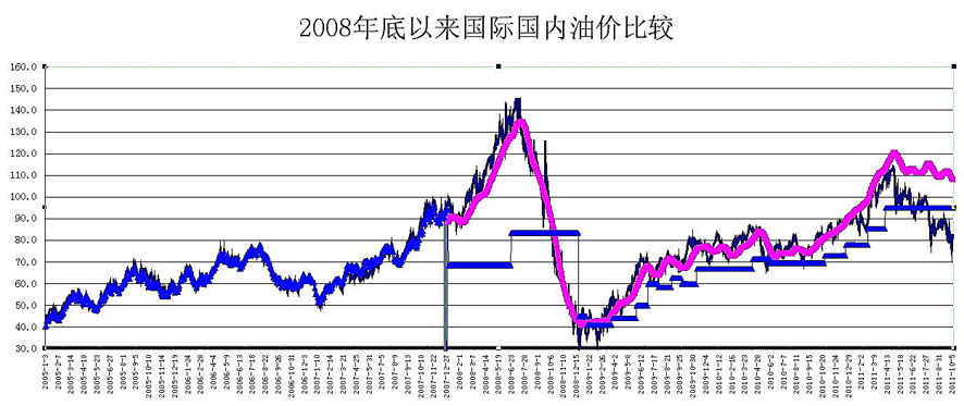 答:2008年底成品油價格和稅費改革方案實施以來,國內成品油價格進行了十六次調整,其中十升六降,價格總水平有所上升,但這主要是由于國際市場油價上升所導致的。至于“漲快跌慢”的問題則完全不存在。在成品油調價操作中,每逢國內油價需上調時,因要考慮對下游行業影響以及通脹壓力,國家不僅適當控制調價幅度,還經常推遲調價時間;每逢國際市場油價大幅下跌時,國家即按當時國際市場油價與上一次調價時水平所對應的降幅及時下調國內成品油價格。因此,從調價操作時間看,不存在“漲快跌慢”問題。這從“2008年底以來國際國內油價比較圖”中可以清楚地看出。