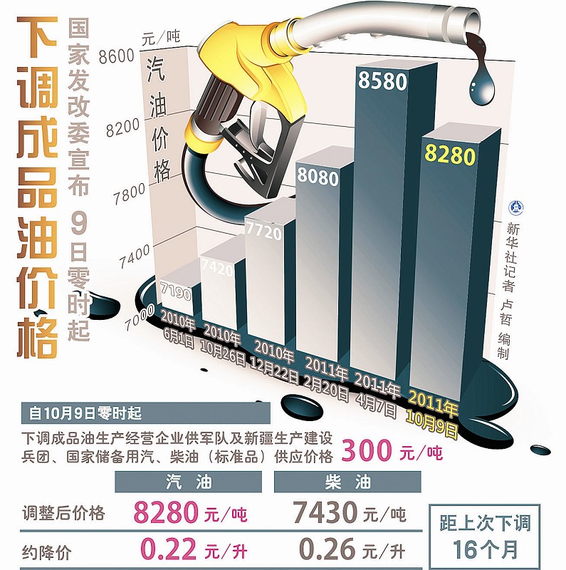 | 2011年10月09日 | 汽柴油價格每噸下調300元 | 2011年04月07日 | 汽柴油價格每噸上調500和400元 |