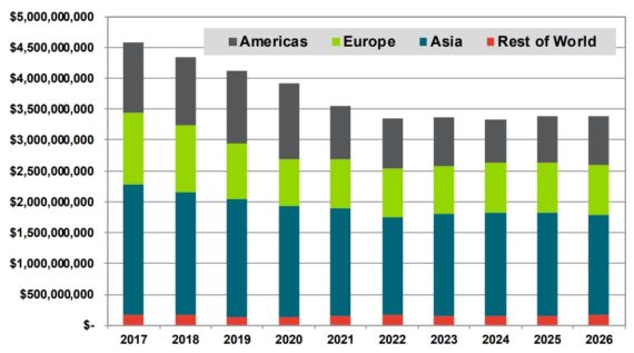 2017年,風機材料市場的估計值為45.7億美元。其中,亞洲市場代表著風機葉片材料的最大區域需求,預計2017年的市場規模為21.2億美元,其次是歐洲11.6億美元,緊隨其后的是美洲11.3億美元。考慮到全球風能市場的規模大且日趨成熟的性質,在未來十年風機葉片材料的增長率并不是太大,在大多數市場上已經達到頂峰并趨于平穩。