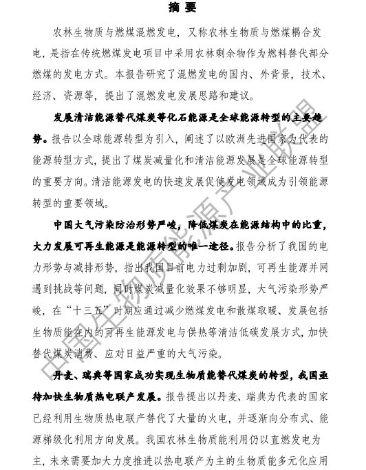 10月13日,中國生物質能源產業聯盟在北京發布《農林生物質與燃煤混燃發電研究報告》。農林生物質與燃煤混燃發電,又稱農林生物質與燃煤耦合發電,是指在傳統燃煤發電項目中采用農林剩余物作為燃料替代部分燃煤的發電方式。本報告研究了混燃發電的國內、外背景,技術、經濟、資源等,提出了混燃發電發展思路和建議。報告指出: