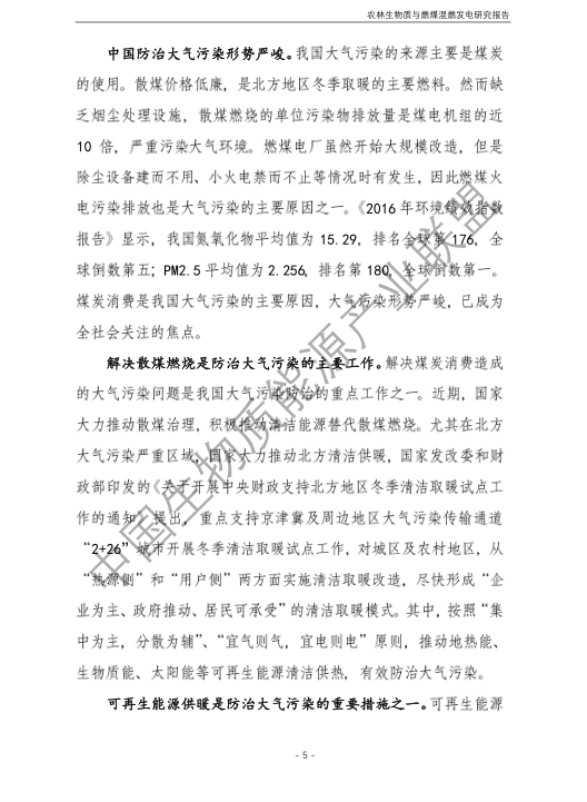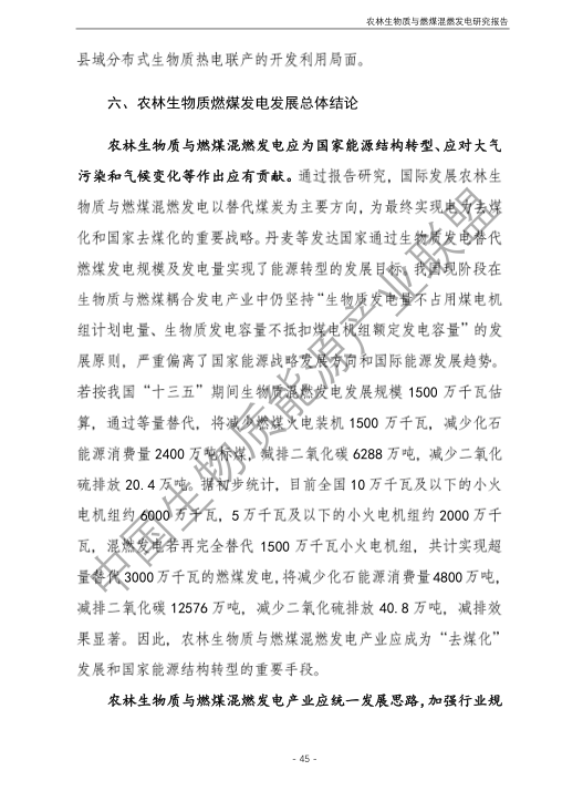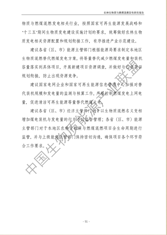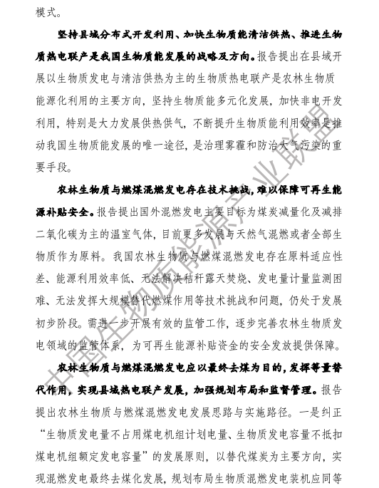 6.農林生物質與燃煤混燃發電應以最終去煤為目的,發揮等量替代作用,實現縣城熱電聯產發展,加強規劃布局和監督管理。報告提出農林生物質與燃煤混燃發電發展思路與實施路徑。一是糾正生物質發電量不占用煤電機組計劃電量、生物質發電容量不抵扣煤電機組額定發電容量”的發展原則,以替代煤炭為主要方向,實現混燃發電最終去煤化發展,規劃布局生物質混燃發電裝機應同等減少煤電裝機,并根據生物質發電量等量削減燃煤發電計劃。二是堅持以縣域分布式熱電聯產發展的根本定位,明確以符合生物質能產業統一規劃管理為前提,統籌規劃布局生物質發電項目和混燃發電示范項目,實現熱電聯產技術示范和應用。三是推動產業技術標準和監管體系建設,加強監督管理,防止以生物質混燃發電名義變相增加煤電機組利用小時數和燃煤發電量指標,切實落實烯煤發電量削減計劃。