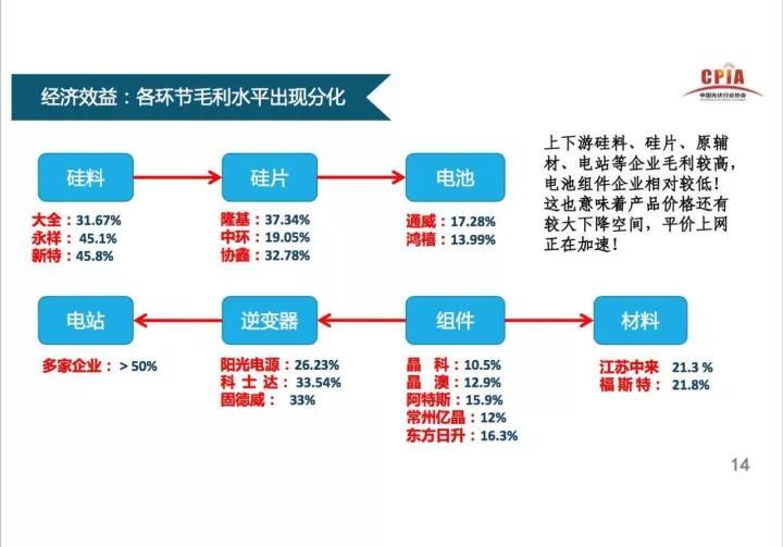 50GW的新增光伏裝機容量,今年光伏全產(chǎn)業(yè)鏈都趕上了好年景,中國光伏行業(yè)協(xié)會秘書長王勃華在發(fā)言時展示了一張圖片,可以更加直觀地看到光伏制造業(yè)今年的日子是很好過的,尤其是硅片、硅片上游環(huán)節(jié),逆變器企業(yè)的毛利率水平也令人羨慕。