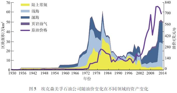 低油價時期單純的上游勘探開發公司相對一體化公司容易出現現金流不足而面臨經營困境的狀況。而油價跌入谷底時,是現金流相對充裕的公司抄底并購、優化公司資產結構的最佳時機,這時候大部分公司資產收購和剝離頻繁,更偏向于投資風險小的陸上區塊(圖5)。一體化的石油巨頭之間也可能通過兼并、重組大幅度降低成本,顯著提高經濟效率,擴大規模,提高競爭力。
