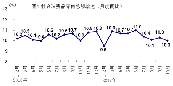 10月份,社會(huì)消費(fèi)品零售總額34241億元,同比增長(zhǎng)10.0%,增速比上月回落0.3個(gè)百分點(diǎn),與上年同月持平。按經(jīng)營(yíng)單位所在地分,城鎮(zhèn)消費(fèi)品零售額29537億元,同比增長(zhǎng)9.8%;鄉(xiāng)村消費(fèi)品零售額4704億元,增長(zhǎng)11.3%。按消費(fèi)類型分,餐飲收入3852億元,增長(zhǎng)10.3%;商品零售30389億元,增長(zhǎng)10.0%。消費(fèi)升級(jí)類商品快速增長(zhǎng),10月份,限額以上單位體育娛樂(lè)用品類、化妝品類商品零售額同比分別增長(zhǎng)19.6%和16.1%。1-10月份,社會(huì)消費(fèi)品零售總額同比增長(zhǎng)10.3%,增速與上年同期持平。