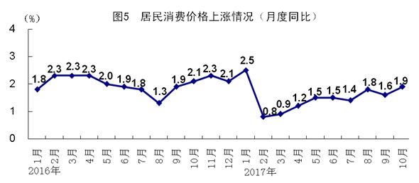 10月份,全國(guó)居民消費(fèi)價(jià)格同比上漲1.9%,漲幅比上月擴(kuò)大0.3個(gè)百分點(diǎn)。分類別看,食品煙酒價(jià)格同比上漲0.3%,衣著上漲1.2%,居住上漲2.8%,生活用品及服務(wù)上漲1.5%,交通和通信上漲0.8%,教育文化和娛樂(lè)上漲2.3%,醫(yī)療保健上漲7.2%,其他用品和服務(wù)上漲1.8%。在食品煙酒價(jià)格中,糧食價(jià)格上漲1.6%,豬肉價(jià)格下降10.1%,鮮菜價(jià)格上漲0.3%。10月份,全國(guó)居民消費(fèi)價(jià)格環(huán)比上漲0.1%。1-10月份,全國(guó)居民消費(fèi)價(jià)格同比上漲1.5%。