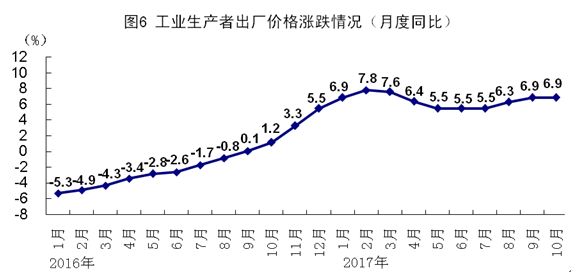 10月份,全國(guó)工業(yè)生產(chǎn)者出廠價(jià)格同比上漲6.9%,漲幅與上月持平,環(huán)比上漲0.7%。1-10月份,全國(guó)工業(yè)生產(chǎn)者出廠價(jià)格同比上漲6.5%。10月份,全國(guó)工業(yè)生產(chǎn)者購(gòu)進(jìn)價(jià)格同比上漲8.4%,環(huán)比上漲0.9%。1-10月份,全國(guó)工業(yè)生產(chǎn)者購(gòu)進(jìn)價(jià)格同比上漲8.4%。