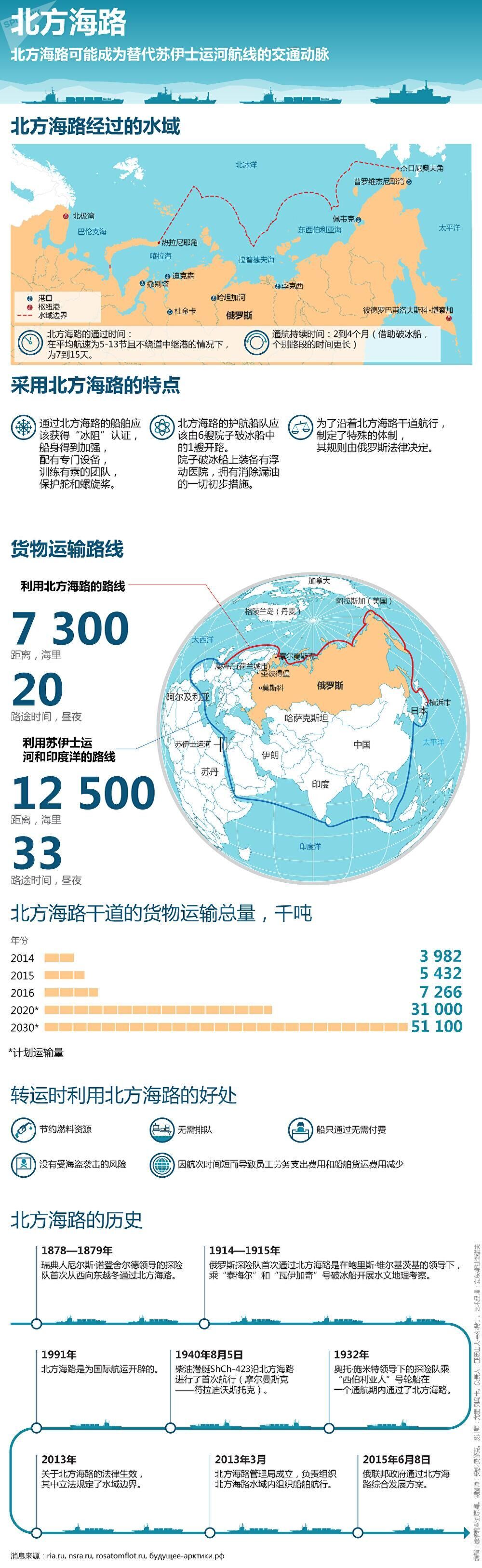 北方海路沿著俄羅斯北部海岸線,將好幾個(gè)港口串連起來,是俄羅斯遠(yuǎn)東地區(qū)到歐洲的最短路線,比通過蘇伊士運(yùn)河穿越南部海洋的路線幾乎短一半。