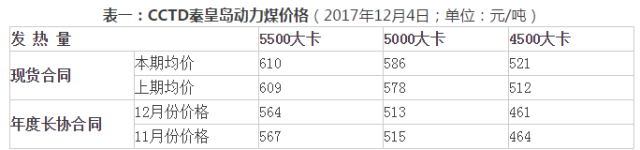 本報告期(11月25日至12月1日,見表一),“CCTD秦皇島動力煤價格”所采集的環(huán)渤海地區(qū)各種現貨動力煤價格整體上呈現止跌跡象,低熱值現貨動力煤價格則略有回升。其中,CCTD5500報收于610元/噸,比11月27發(fā)布的價格上漲了1元/噸;CCTD5000報收于586元/噸,比11月27發(fā)布的價格上漲了8元/噸。