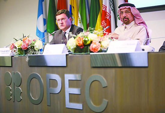 11月30日,歐佩克在維也納舉行第173屆半年度的部長級會議,圖為俄羅斯能源部部長諾瓦克(左)及沙特能源大臣法利赫(右)在會議上發言。(來源:視覺中國)
