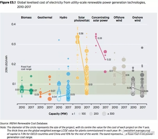 在以上各類可再生能源發(fā)電技術(shù)中,除了水電、地?zé)岚l(fā)電成本上升以外,其他技術(shù)自2010年以來都有明顯下降,尤其是光伏成本下降超過70%。IRENA認(rèn)為,風(fēng)電、光伏、光熱成本下降主要源于三個(gè)因素:1)技術(shù)進(jìn)步帶來的效率提高;2)競(jìng)標(biāo)逐步替代固定上網(wǎng)電價(jià)補(bǔ)貼;3)出現(xiàn)了一批有實(shí)力有經(jīng)驗(yàn)的開發(fā)商,開發(fā)的項(xiàng)目規(guī)模化。