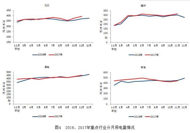 1-11月份,化學(xué)原料制品、非金屬礦物制品、黑色金屬冶煉和有色金屬冶煉四大高載能行業(yè)用電量合計(jì)16565億千瓦時(shí),同比增長(zhǎng)4.3%,增速比上年同期提高5.2個(gè)百分點(diǎn);合計(jì)用電量占全社會(huì)用電量的比重為28.9%,對(duì)全社會(huì)用電量增長(zhǎng)的貢獻(xiàn)率為19.7%。其中,化工行業(yè)用電量4057億千瓦時(shí),同比增長(zhǎng)4.4%,增速比上年同期提高3.2個(gè)百分點(diǎn);建材行業(yè)用電量3016億千瓦時(shí),同比增長(zhǎng)3.6%,增速比上年同期提高1.2個(gè)百分點(diǎn);黑色金屬冶煉行業(yè)用電量4497億千瓦時(shí),同比增長(zhǎng)1.4%,增速比上年同期提高6.4個(gè)百分點(diǎn);有色金屬冶煉行業(yè)4994億千瓦時(shí),同比增長(zhǎng)7.5%,增速比上年同期提高8.0個(gè)百分點(diǎn)。