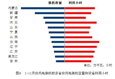 分類型看,1-11月份,全國(guó)水電設(shè)備平均利用小時(shí)為3298小時(shí),比上年同期降低36小時(shí)。在水電裝機(jī)容量超過(guò)1000萬(wàn)千瓦的7個(gè)省份中,除云南、湖北和青海同比分別增加308、262和146小時(shí)外,其余省份水電設(shè)備平均利用小時(shí)同比均有不同程度降低,其中,湖南同比降低356小時(shí),貴州和廣西同比分別降低160和113小時(shí);全國(guó)火電設(shè)備平均利用小時(shí)為3772小時(shí),比上年同期增加16小時(shí)。分省份看,全國(guó)共有13個(gè)省份火電設(shè)備利用小時(shí)超過(guò)全國(guó)平均水平,其中寧夏、河北和江西超過(guò)4500小時(shí),云南和西藏分別僅為1099和88小時(shí)。與上年同期相比,全國(guó)共有17個(gè)省份火電利用小時(shí)數(shù)同比增加,其中,福建、江西和青海同比增加超過(guò)300小時(shí),同比分別增加553、413和355小時(shí),廣東、湖南和浙江同比增加超過(guò)200小時(shí),陜西、寧夏和山西同比增加超過(guò)100小時(shí),而北京和山東同比降低超過(guò)400小時(shí),同比分別降低479和430小時(shí),廣西和重慶同比降低接近300小時(shí),江蘇、海南和甘肅同比降低超過(guò)100小時(shí);全國(guó)核電設(shè)備平均利用小時(shí)6504小時(shí),比上年同期增加126小時(shí);全國(guó)風(fēng)電設(shè)備平均利用小時(shí)1752小時(shí),比上年同期增加179小時(shí)。