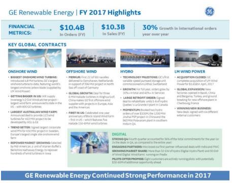 本周,通用電氣公布2017年財(cái)報(bào)稱,2017年可再生能源業(yè)績(jī)表現(xiàn)搶眼,訂單總額達(dá)到103億美元。