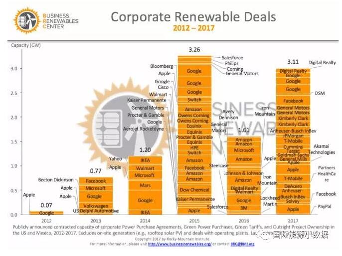 各國公司以可再生能源供電為榮,這一趨勢還在持續擴大。到2017年止,各國大公司(如谷歌、Facebook)簽下的可再生能源供電累計達到10吉瓦,其中3吉瓦是2017年新簽購電合同。