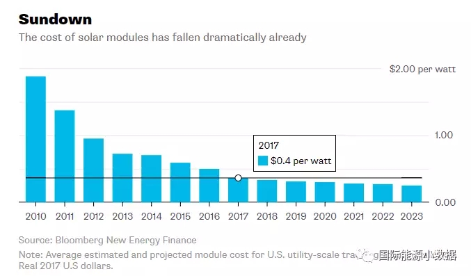 2010年全球光伏組件平均價格為1.9美元/瓦,到2017年已經降至0.40美元/瓦,7年降幅達到79%。那么,在未來幾年光伏組件價格還有多大的降幅空間?彭博新能源財經(BNEF)預測,光伏組件價格下降趨勢向緩,到2023年光伏組件平均價格約為0.30美元/千瓦時(2017年不變美元計算),6年降幅為25%。