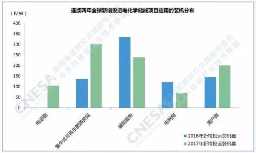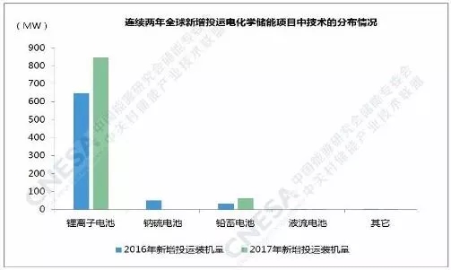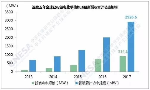據儲能聯盟的不完全統計,截至2017年底,全球已投運儲能項目累計裝機規模為175.4GW。其中,抽水蓄能的累計裝機占比最大,為96%,較上一年下降1個百分點。電化學儲能項目的累計功率規模為2926.6MW,占比1.7%,較上一年增長0.5個百分點。2017年,全球新增投運電化學儲能項目的功率規模為914.1MW,同比增速超過20%。