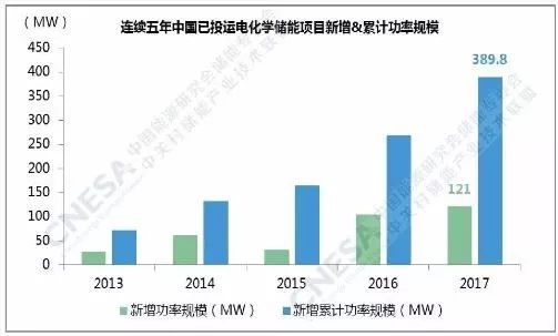 據儲能聯盟的不完全統計,截至2017年底,中國已投運儲能項目累計裝機規模為28.9GW。其中,抽水蓄能的累計裝機占比最大,接近99%,電化學儲能項目的累計裝機規模緊隨其后,為389.8MW,占比為1.3%,較上一年增長0.2個百分點。2017年,中國新增投運電化學儲能項目的功率規模為121MW,同比增速超過15%。
