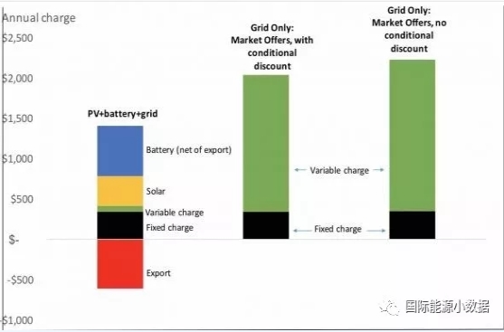 那么,如果澳大利亞居民無法忍受如此高昂的電網(wǎng)供電價格,自家安裝5千瓦的光伏系統(tǒng)(價格5500澳元,壽命20年),再加上特斯拉第二代電池包(Tesla Powerwall 2,容量13.5千瓦時,2018年售價11,075澳元),光伏余電上網(wǎng)電價收入0.16澳元/千瓦時,那么這一套系統(tǒng)每年的支出費(fèi)用明顯低于電網(wǎng)電價。