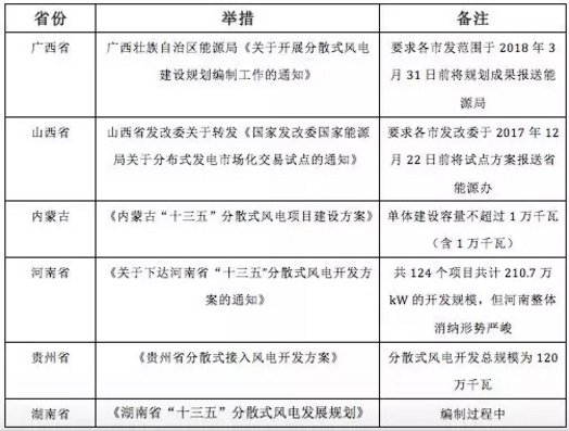 在“三北”地區(qū)棄風(fēng)限電形勢嚴峻以及市場上優(yōu)質(zhì)集中式項目逐步開發(fā)殆盡的情況下,風(fēng)電從集中大規(guī)模連片開發(fā)轉(zhuǎn)向集中式和分散式協(xié)同發(fā)展勢在必行, 2017年5月國家能源局發(fā)布了《關(guān)于加快推進分散式接入風(fēng)電項目建設(shè)有關(guān)要求的通知》,要求各省級能源主管部門制定分散式風(fēng)電發(fā)展方案,明確分散式風(fēng)電項目不受年度指導(dǎo)規(guī)模限制。隨后各省加快了制定分散式風(fēng)電發(fā)展方案的步伐,目前已明確編制分散式風(fēng)電建設(shè)規(guī)劃的省份有:廣西、山西、內(nèi)蒙古、河南、貴州和湖南。