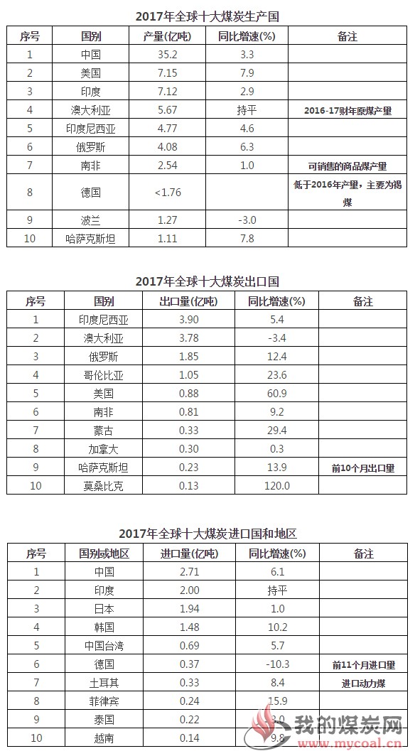 根據(jù)各國統(tǒng)計局、海關(guān)、煤炭產(chǎn)業(yè)部門等機構(gòu)陸續(xù)發(fā)布的煤炭產(chǎn)量、出口、進口等初步統(tǒng)計數(shù)據(jù)整理,2017年全球十大煤炭產(chǎn)量、出口、進口國家和地區(qū)排名如下: