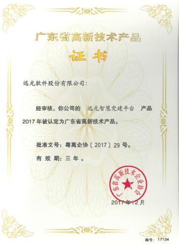近日,由遠(yuǎn)光軟件自主研發(fā)的“遠(yuǎn)光智慧黨建平臺”順利通過廣東省高新技術(shù)企業(yè)協(xié)會認(rèn)定,獲頒發(fā)2017年度“廣東省高新技術(shù)產(chǎn)品”證書。