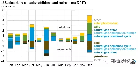2017年有6.3吉瓦煤電裝機(jī)退役,而且全年沒(méi)有任何一座新的煤電廠投運(yùn),2017年末煤電總裝機(jī)為260.3吉瓦。這一年盡管也有4.0吉瓦的天然氣發(fā)電裝機(jī)退役,但是新增天然氣裝機(jī)9.3吉瓦(其中8.2吉瓦為聯(lián)合循環(huán)機(jī)組),年末總裝機(jī)為452.8吉瓦。