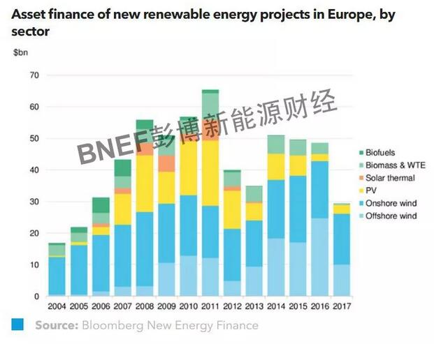 2017年,機(jī)構(gòu)投資者對歐洲可再生能源項目的投資達(dá)到創(chuàng)紀(jì)錄的99億美元,高于2016年的70億美元。最近的一項創(chuàng)新出現(xiàn)在Walney項目擴(kuò)張中,在本次的再融資交易中使用到了通貨膨脹保值債券(CPI-linked bonds)。