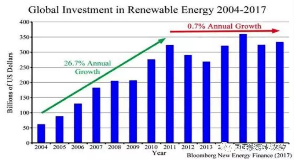 根據彭博新能源財經的數字,2004年到2011年間全球可再生能源投資年增長率為26.7%。然而,2011年到2017年間全球可再生能源投資增長率僅為0.7%。2017年日本可再生能源投資下降16%、印度下降20%、德國下降26%、英國下降56%。美國小幅增長1%,而中國大增30%(1330億美元)。可以說,如果不是因為中國的巨大貢獻,全球的可再生能源投資其實是在下降的。