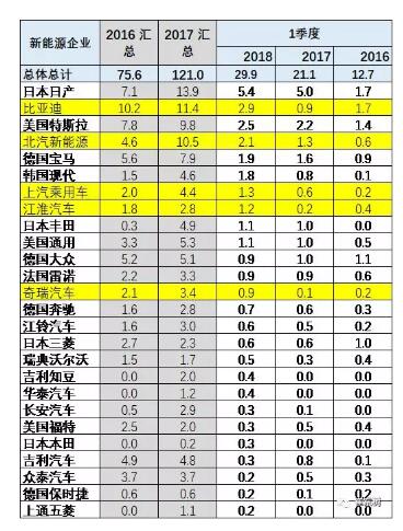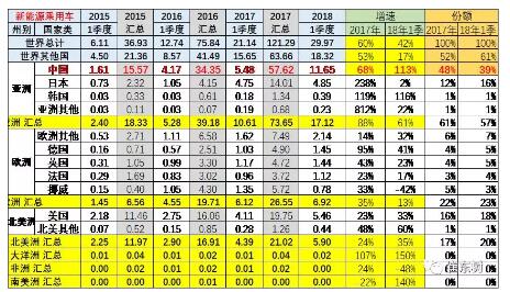 中國新能源車在世界市場的表現不斷的提升之中,16年在世界市場份額達到45%,17年中國的份額上升到47%,其中17年四季度達到59%的單位,18年1-3月份,中國新能源車占世界市場的份額達到37%,相比較17年1-3月份的21%,大幅提升了16個百分點。至于其他國家的形成和基本都處于下降之中,尤其是日本,從17年1到2分的24%下降到今年的21%,日本的新能源車新車優勢,暫時放緩。