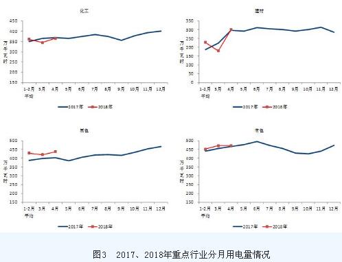 1-4月份,化學原料制品、非金屬礦物制品、黑色金屬冶煉和有色金屬冶煉四大高載能行業用電量合計5929億千瓦時,同比增長4.3%;合計用電量占全社會用電量的比重為28.1%,對全社會用電量增長的貢獻率為13.6%。其中,化工行業用電量1432億千瓦時,同比增長1.7%;建材行業用電量940億千瓦時,同比增長4.2%;黑色金屬冶煉行業用電量1714億千瓦時,同比增長9.6%;有色金屬冶煉行業1844億千瓦時,同比增長1.9%。