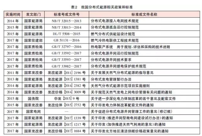 我國分布式能源產(chǎn)業(yè)發(fā)展過程與國外相似,政策從宏觀性鼓勵(lì)到實(shí)質(zhì)性支持,對(duì)分布式能源產(chǎn)業(yè)的健康發(fā)展起到重要的推動(dòng)作用。2011年之后,我國分布式能源產(chǎn)業(yè)政策密集發(fā)布,支持力度也逐步具有實(shí)質(zhì)性。為了進(jìn)一步做好分布式能源項(xiàng)目前期準(zhǔn)備工作,現(xiàn)梳理我國現(xiàn)行主要政策和標(biāo)準(zhǔn),項(xiàng)目投資、建設(shè)單位應(yīng)當(dāng)充分研讀這些文件。我國分布式能源相關(guān)政策和標(biāo)準(zhǔn)見表2,表2中的“—”表示無文件號(hào)。