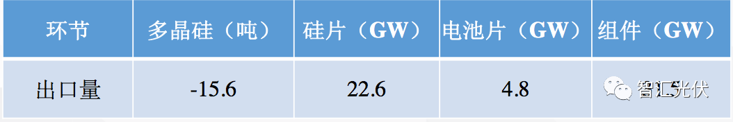 根據中國光伏行業協會的數據,2017年,各環節的出口量如下表所示。