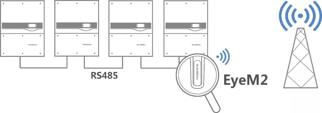 逆變器標配RS485通訊接口,通過通訊線纜“手拉手”式連接,只需給其中一臺逆變器配置EyeM2無線通訊模塊,由其集中上傳所有數(shù)據(jù),不僅讓組網(wǎng)更簡單,還能夠節(jié)省通訊模塊及流量費用;同時通過陽光云APP掃描通訊模塊二維碼接入智慧能源管理平臺,一鍵掃碼建站,大大提升建站效率。